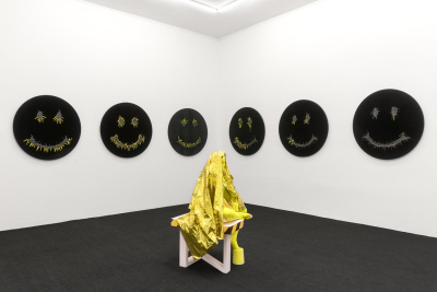 Her own formulated ink medium is custom mixed to make 'ink' of different pigments. It is poured into sheets then cut and assembled to form a smlley face using the pigment to express eight phases of the moon. Ink relief fused onto stretched velvet on wood panel.